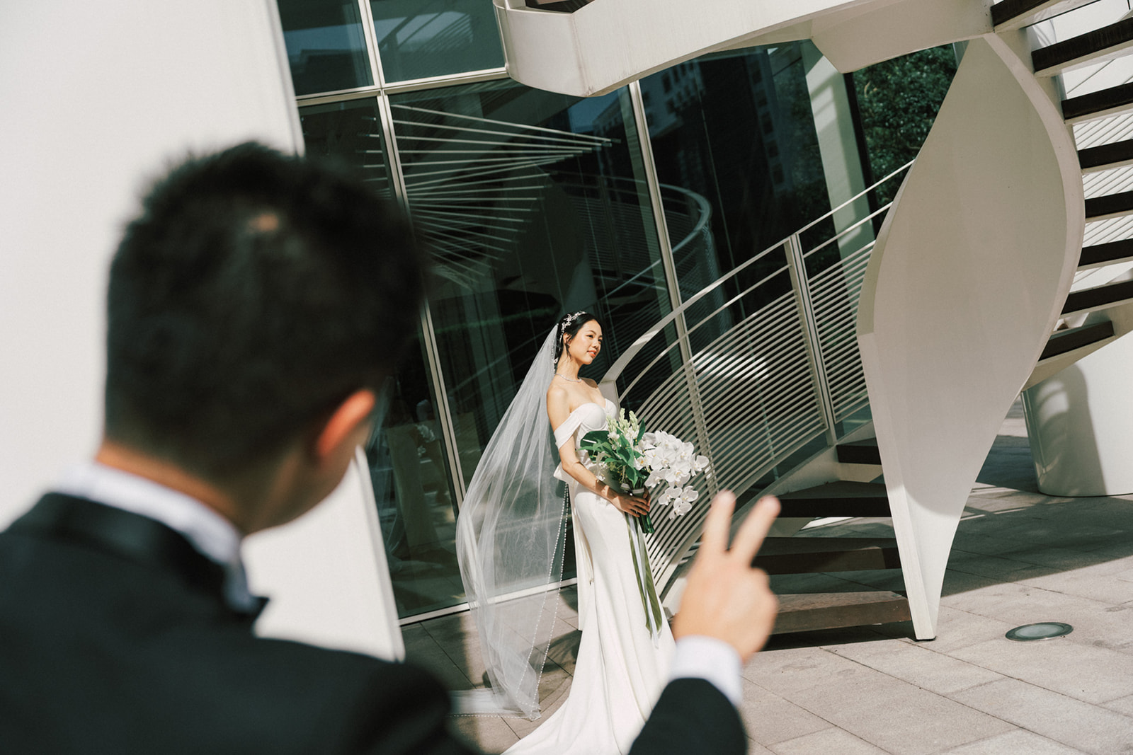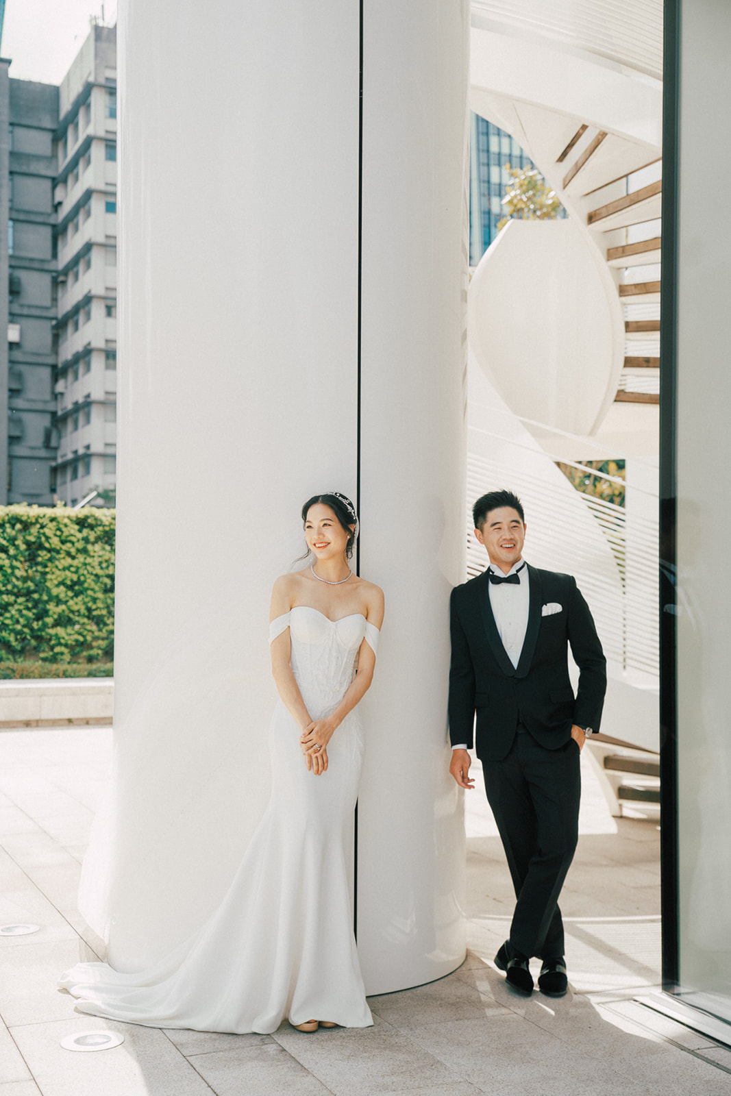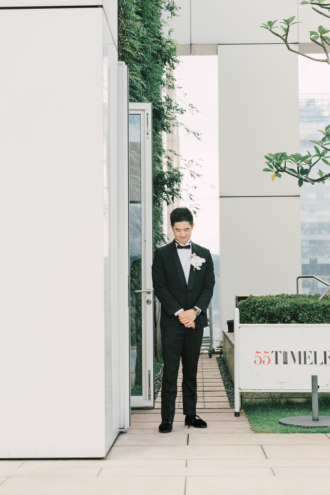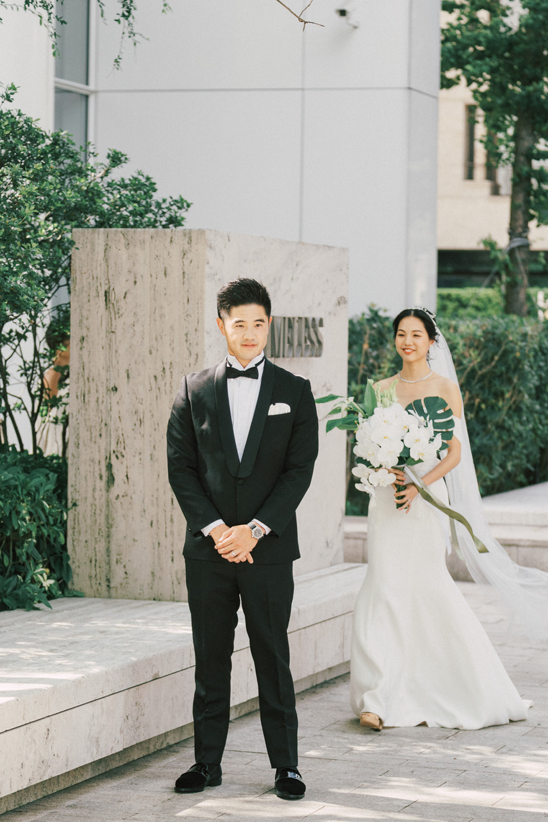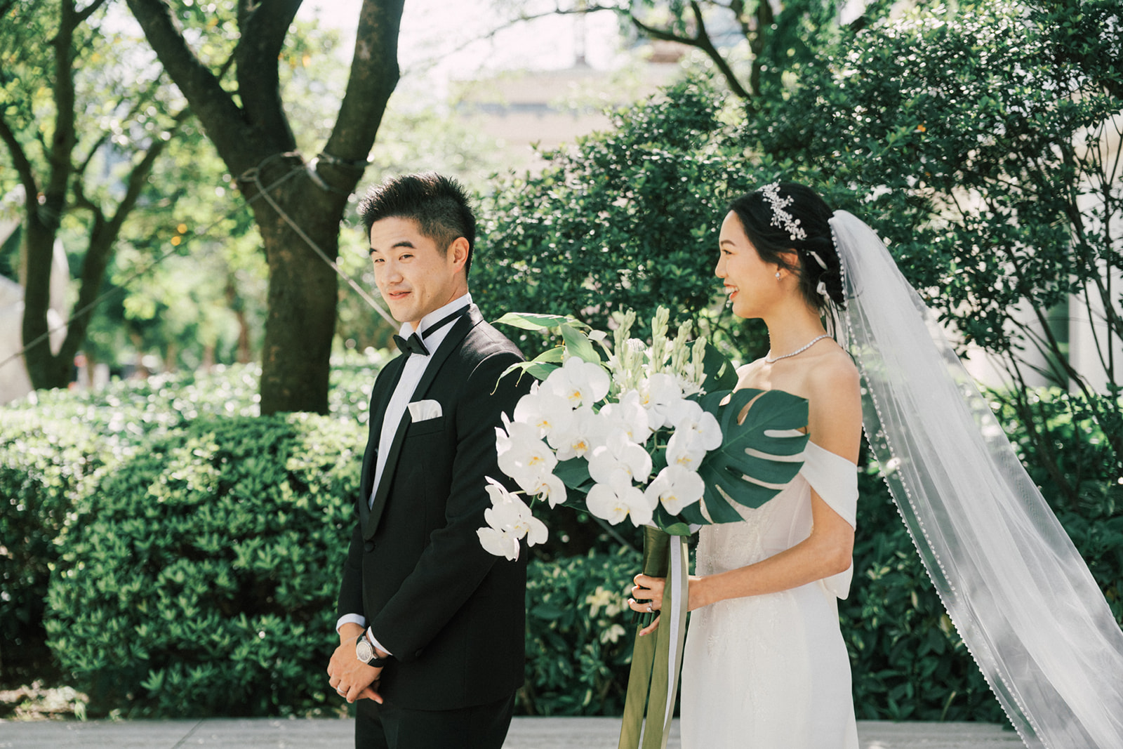 而我還記得一個有意思片段,新娘的爸爸說First Look你可以在一樓門口那拍。好傢伙,這一樓剛好就正挨著捷運站口啊~ 我問了新郎對於First Look的地點,你有什麼想法,他說:我喜歡綠色多一點, 對了,我怕熱,可能撐不了太久。