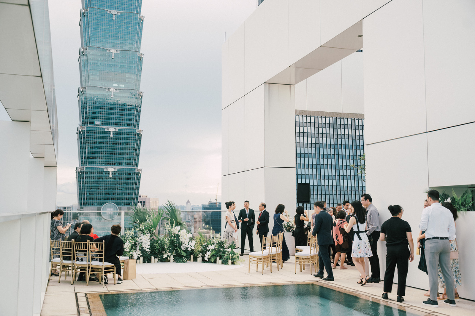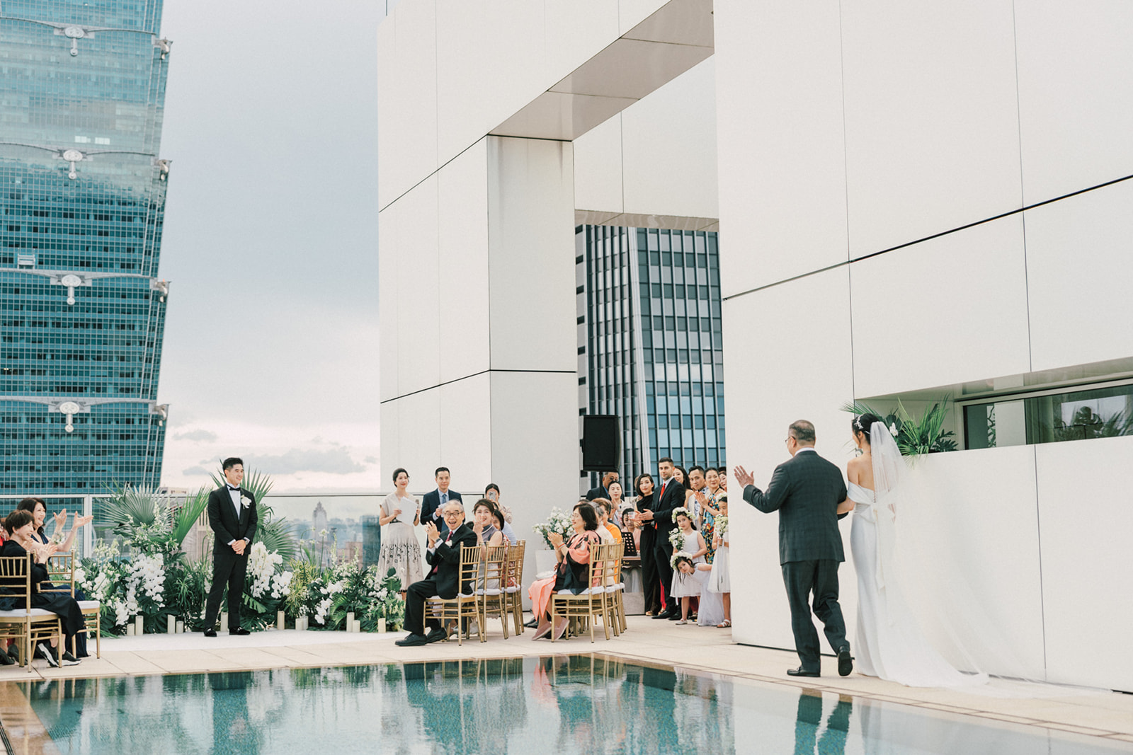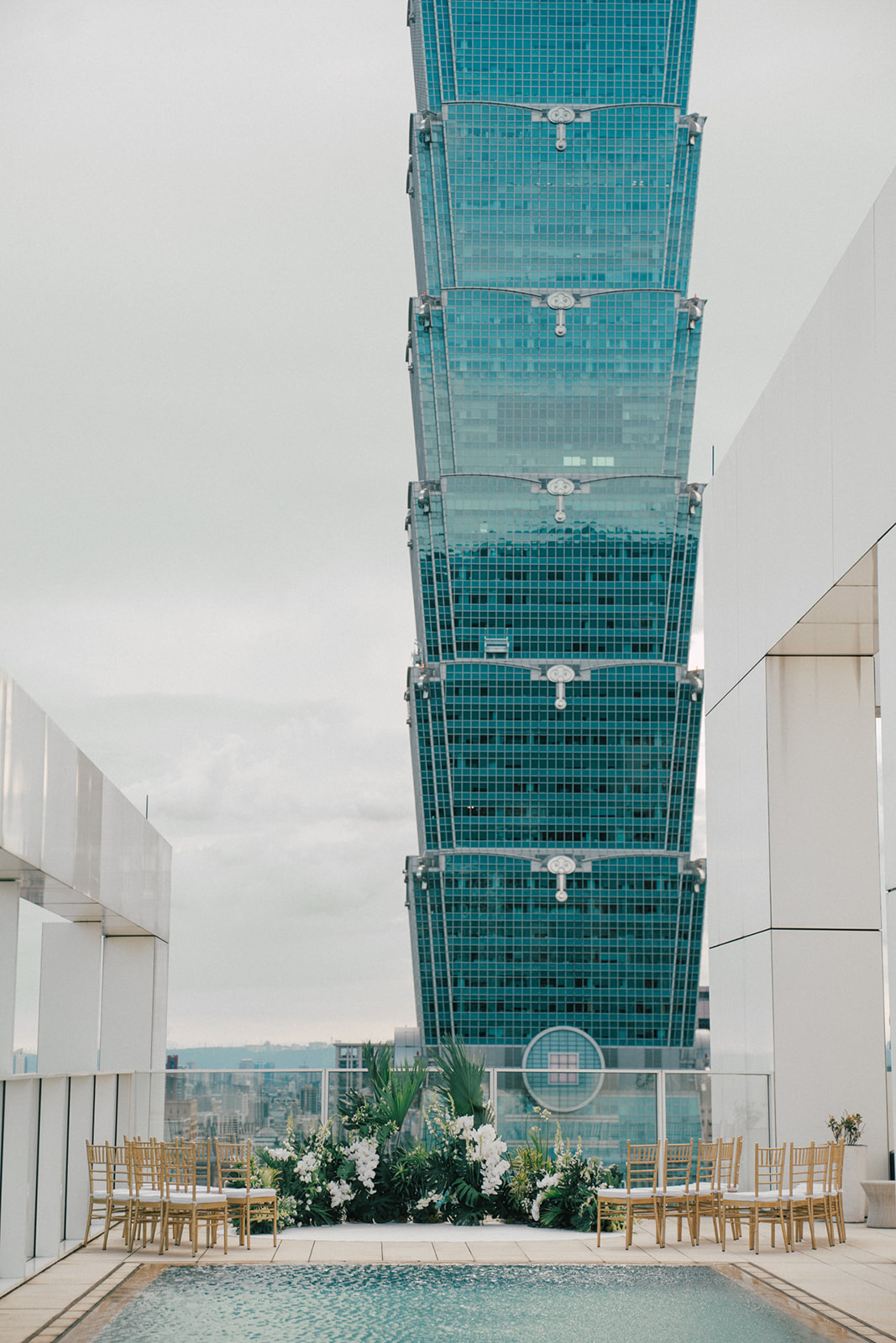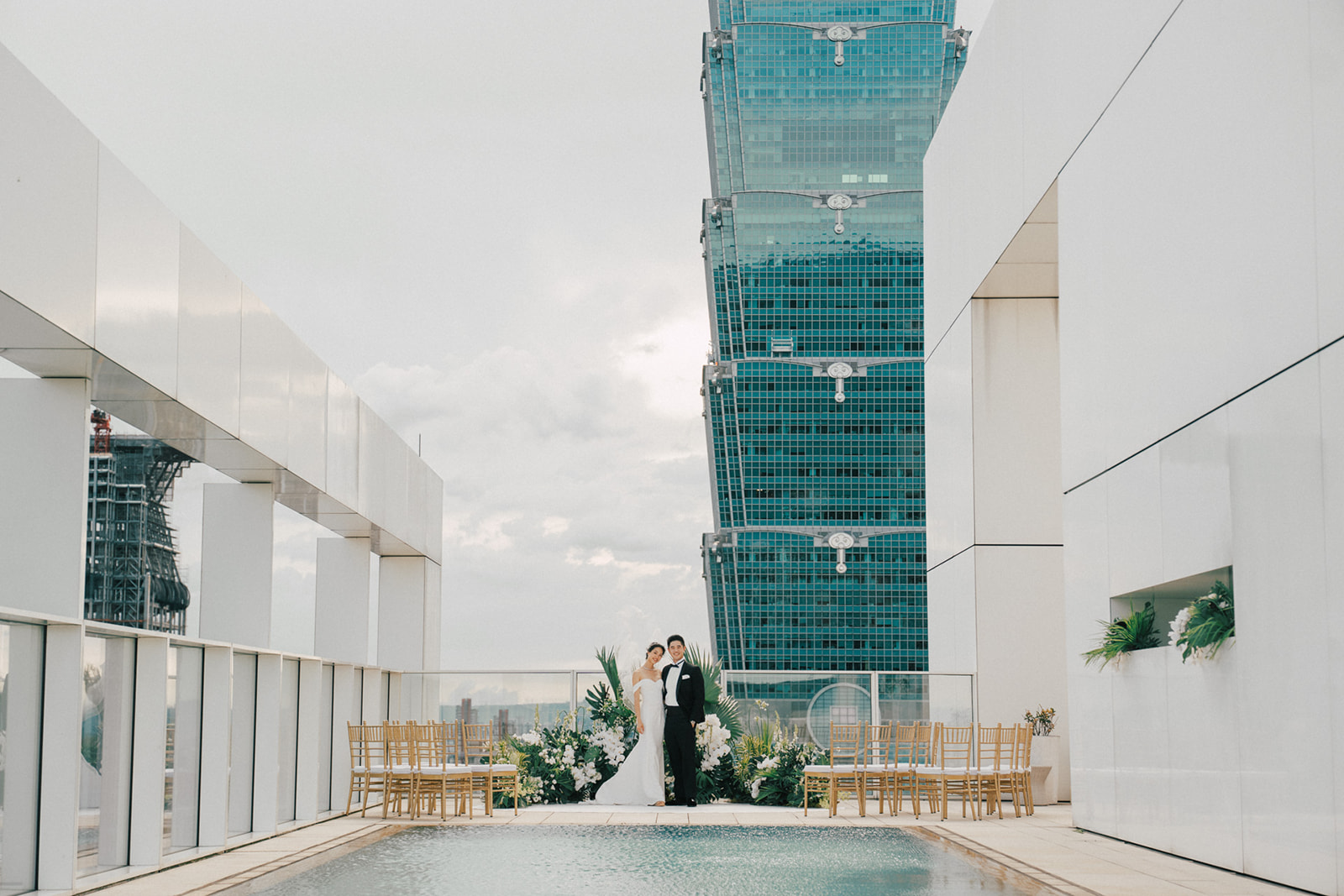 新人是我之前拍過新娘的妹妹,所以已經見過許多次了,而這次的拍攝,他們給了我一個很特別的企劃,他們要簡單,方便,但又能夠獨特的婚禮,於是他們選擇了在自家大樓的樓頂泳池舉辦婚禮。